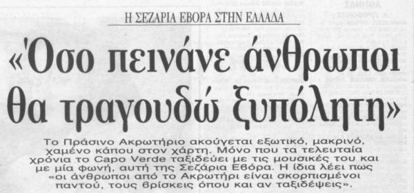 »Στην ερμηνεία της μένει αξεπέραστα ζεστή, ανθρώπινη κι αληθινή, όπως στα πρώτα της τραγούδια. Με τη διαφορά ότι η “ξυπόλητη ντίβα” μας έχει κοντά της την αναγνώριση του κόσμου, των θεωρητικών της μουσικής, των σταρ (και της Μαντόνα της ίδιας, εξάλλου) και των μεγάλων ακροατηρίων από τη Νέα Υόρκη και το Παρίσι, και τον Λυκαβηττό αύριο βράδυ. Η Σεζάρια Εβόρα δεν χάνει την ευκαιρία να δηλώσει, πως “όσο υπάρχουν άνθρωποι που πεινάνε, θα τραγουδώ ξυπόλητη”!»