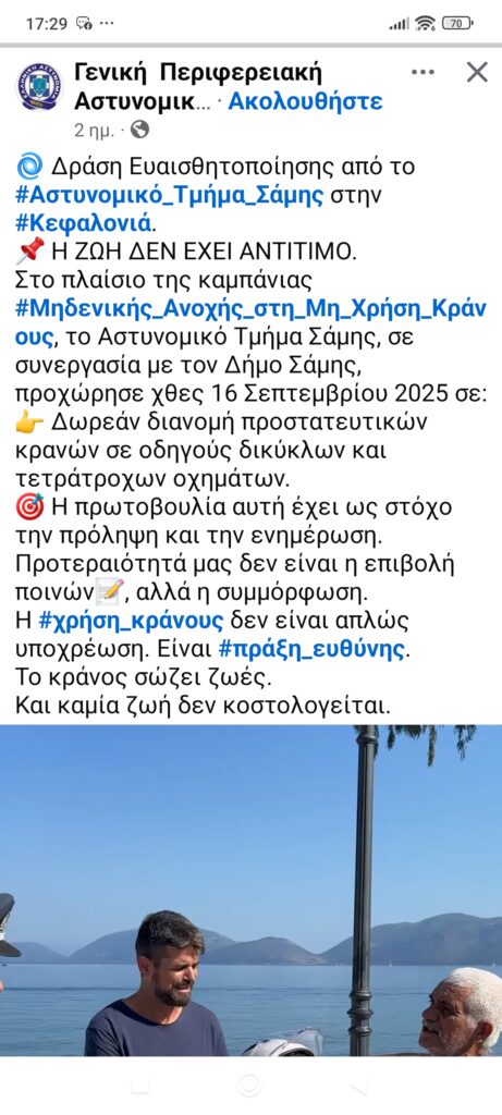 Υ,Γ, Σύμφωνα με δημοσιεύματα το Αστυνομικό Τμήμα Σάμης Κεφαλονιάς, στα πλαίσια της καμπάνιας «μηδενική ανοχή-μη χρήση Κράνους»[ και δράσεων αυαισθητοποίησης των πολιτών, σε συνεργασία με τον Δήμο Σάμης, πήρε πρωτοβουλίες και διένειμε προστατευτικά κράνη σε οδηγούς δίκυκλων και τετράτροχων οχημάτων. Η πρωτοβουλία αυτή, όπως ανακοινώθηκε, είχε στόχο την πρόληψη και την ενημέρωση των πολιτών, πάνω σε ζητήματα που αφορούν την προστασία τους από τη μη χρήση κράνους, καθώς, όπως τους ενημέρωσαν «καμία ζωή δεν κοστολογείται»