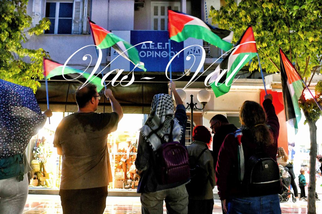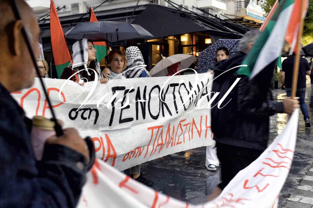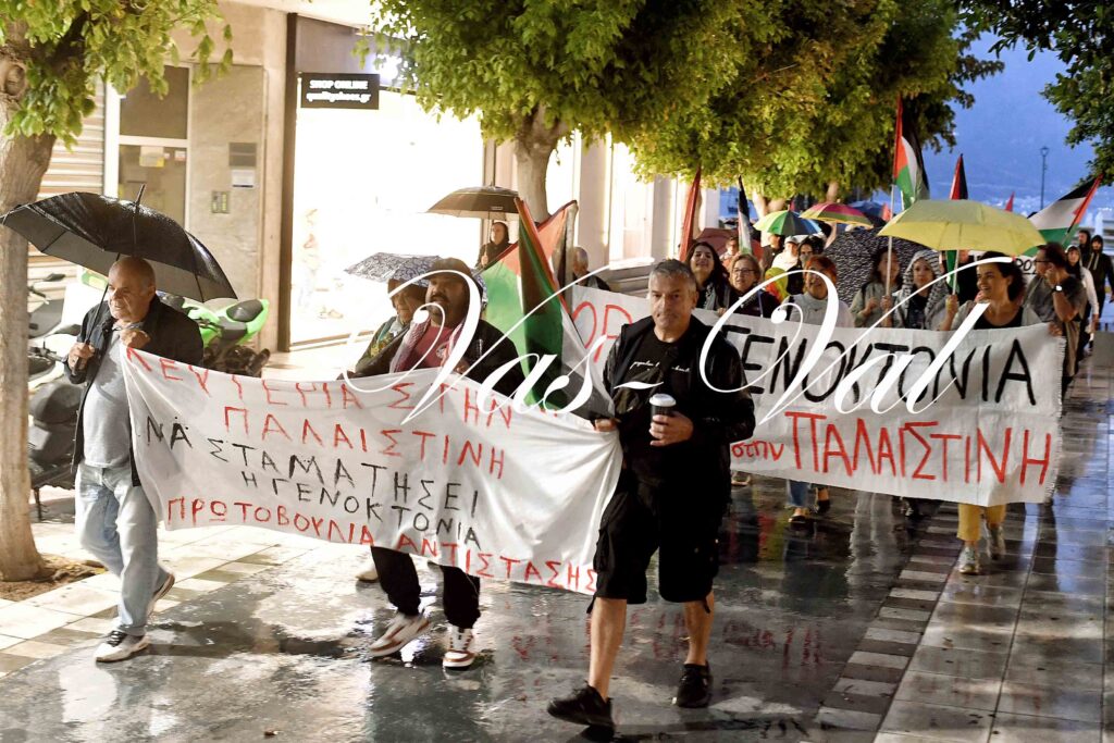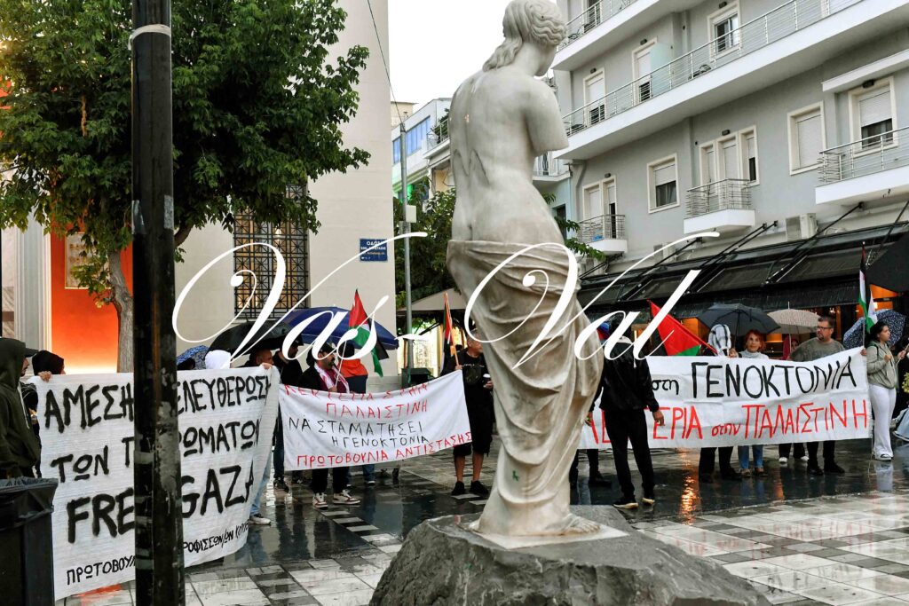 Ο κόσμος κινήθηκε στους κεντρικούς δρόμους της πόλης φωνάζοντας συνθήματα έξω απο τα γραφεία της ΝΔ κατά του Ισραήλ και της σιωπής της διεθνούς κοινότητας. Η πορεία έκανε στάση στην κεντρική πλατεία, όπου πραγματοποιήθηκαν ομιλίες και κατατέθηκαν αιτήματα προς τις αρμόδιες αρχές.
