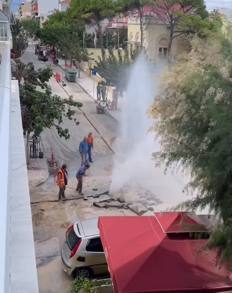 Σήμερα, ο εργολάβος των οπτικών ινών “πέτυχε” διάνα: βρήκε… νερό! Και τι νερό! Ένας πίδακας που προκάλεσε δέος στους περαστικούς.