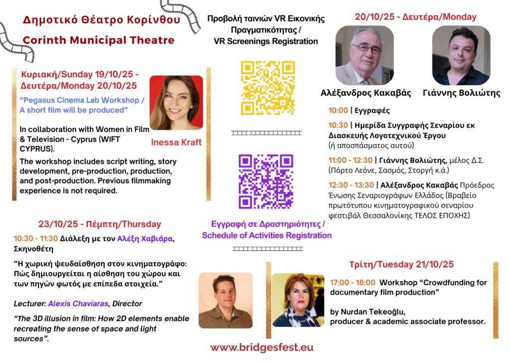 - Σεμινάριο υποκριτικής για σκηνοθέτες και σκηνοθεσίας για ηθοποιούς, με την βραβευμένη ηθοποιό και σκηνοθέτρια Ινέσα Κραφτ και Κινηματογραφικό εργαστήρι Πήγασος με εισηγήσεις διακεκριμένων κινηματογραφιστών. Συνεργασία με τον οργανισμό Women in Film and Television-Cyprus. Δημιουργία ταινίας μικρού μήκους που θα προβληθεί στην τελετή απονομής βραβείων Χρυσός Πήγασος. Το εργαστήρι απευθύνεται σε εφήβους και ενήλικες που θέλουν να γνωρίσουν τη διαδικασία παραγωγής μιας κινηματογραφικής ταινίας. Δήλωση συμμετοχής έως 15/10 στο 2741303012 και bridgescorinth@gmail.com (Οι ανήλικοι θα συνοδεύονται από γονέα).