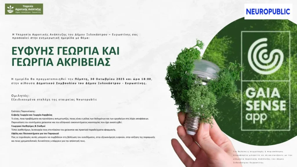 Η Υπηρεσία Αγροτικής Ανάπτυξης του Δήμου Ξυλοκάστρου – Ευρωστίνης σας προσκαλεί στην ενημερωτική ημερίδα με θέμα: ΕΥΦΥΗΣ ΓΕΩΡΓΙΑ ΚΑΙ ΓΕΩΡΓΙΑ ΑΚΡΙΒΕΙΑΣ