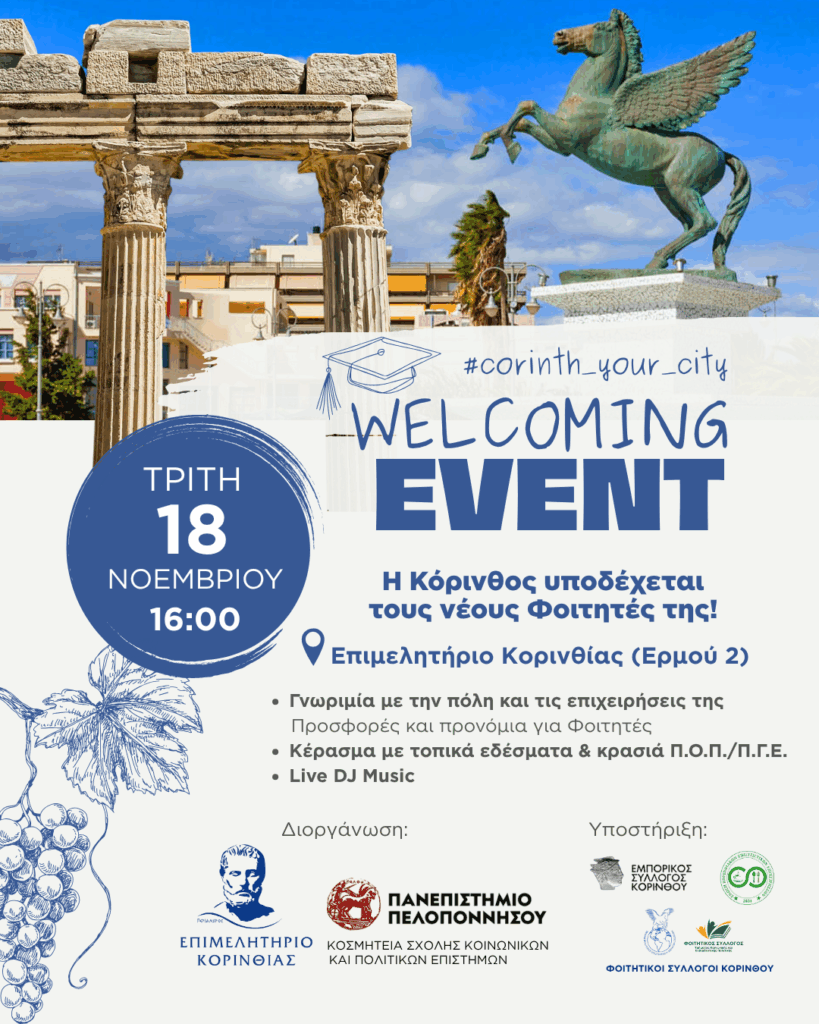 Στο πλαίσιο του Welcoming Event – “Η Κόρινθος υποδέχεται τους νέους φοιτητές της”, που θα πραγματοποιηθεί την Τρίτη 18 Νοεμβρίου 2025, ώρα 16:00, στο Επιμελητήριο Κορινθίας (Ερμού 2), προσκαλούνται οι επιχειρήσεις της πόλης να δηλώσουν συμμετοχή προσφέροντας εκπτώσεις, προνόμια ή ειδικές προσφορές στους φοιτητές των τμημάτων: